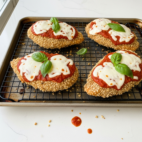 Place the coated chicken breasts in the air fryer basket in a single layer. You may need to cook them in batches depending on the size of your air fryer. Cook for about 10-12 minutes, flipping halfway through. Once the chicken is cooked through and golden, add the marinara and cheese toppings and cook for another 2-3 minutes, just until the cheese is melted and bubbly. The air fryer is a great option for speed and crispiness.