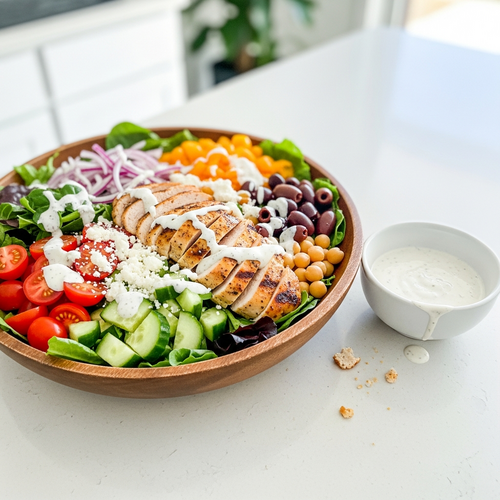 The absolute star of this recipe is our High-Protein Greek Yogurt Dressing. This is where we make a huge upgrade from traditional Greek salads that are often swimming in oil. By using low-fat Greek yogurt as the base, we slash the calories and fat while dramatically increasing the protein content. It makes the salad incredibly creamy and satisfying without derailing your macros.