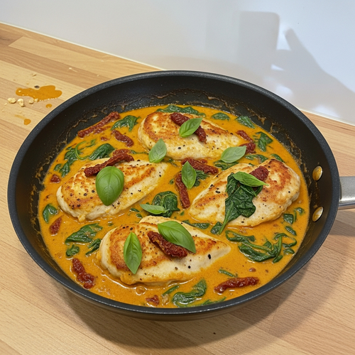 We ditch the traditional heavy cream, which is loaded with fat and calories, for a much smarter combination. We use Neufchâtel cheese, which has about a third less fat than regular cream cheese but still provides that rich, creamy texture. We pair that with low-sodium chicken broth to create a flavorful sauce base without adding unnecessary calories. The sun-dried tomatoes and fresh spinach add nutrients, fiber, and volume to the meal, helping you feel even fuller on fewer calories. It’s a complete meal that feels indulgent but lines up perfectly with your macros.